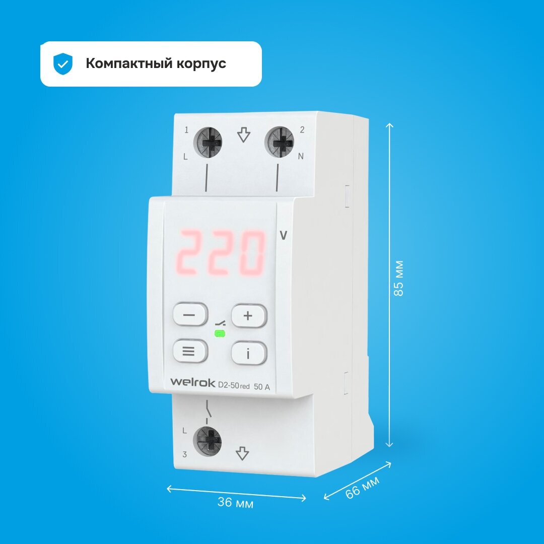 Реле напряжения Welrok D2-50 RED, 50А, однофазное, двухмодульное с красной индикацией, улучшенный аналог RBUZ D2-50