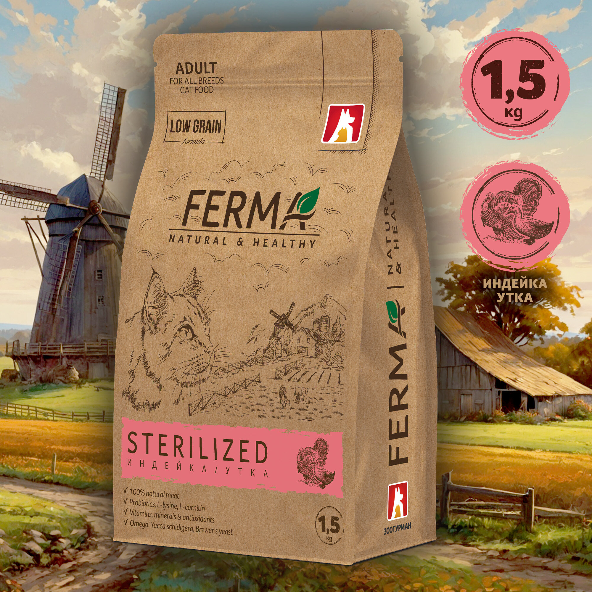 Корм для кошек Полнорационный сухой корм для взрослых котов и кошек Зоогурман, FERMA «STERILISED» Индейка/Утка 1,5 кг