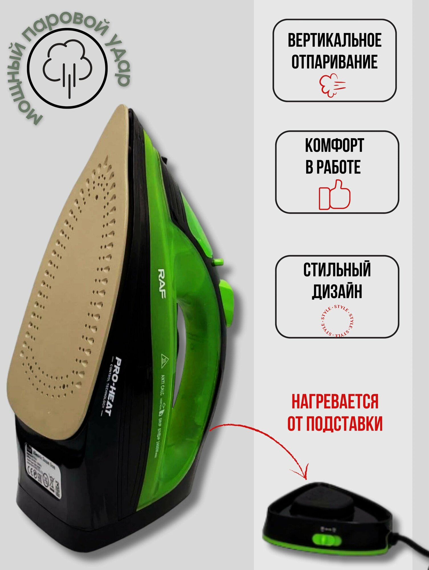 Утюги Беспроводной электрический паровой утюг RAF R-1210, 2400 Вт, для одежды, с антипригарной подошвой и функцией самоочистки, зеленый