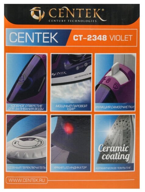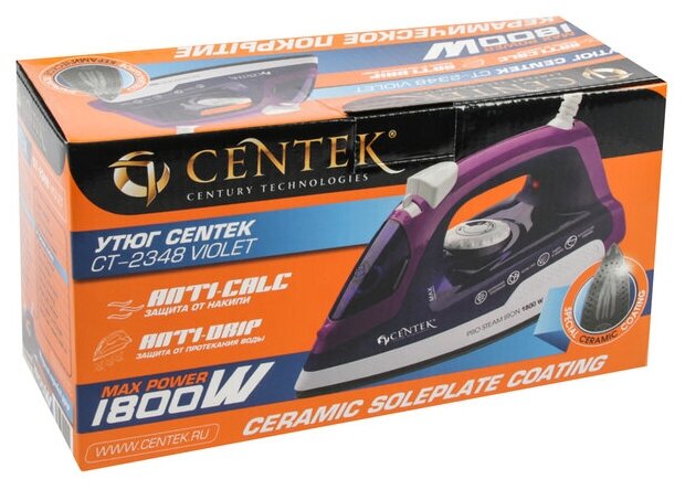 Утюг Centek CT-2348 VIOLET (фиолет) 1800Вт, керамическая подошва, паровой удар, самоочистка, 200мл