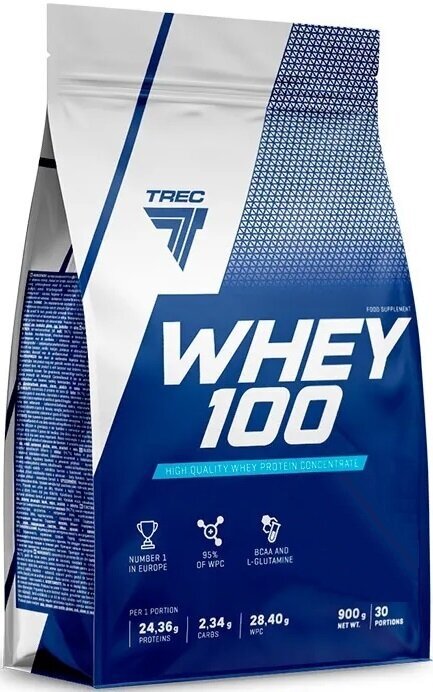 Протеины Протеин сывороточный натуральный Whey 100 900 г, клубника, Trec Nutrition, (белковый коктейль для набора мышечной массы, концентрат белка, спортивное питание, protein)