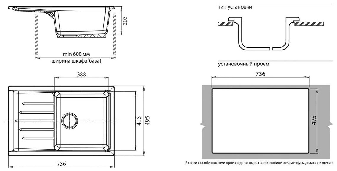| Размеры врезного отверстия (накладная) | 740x420 мм |