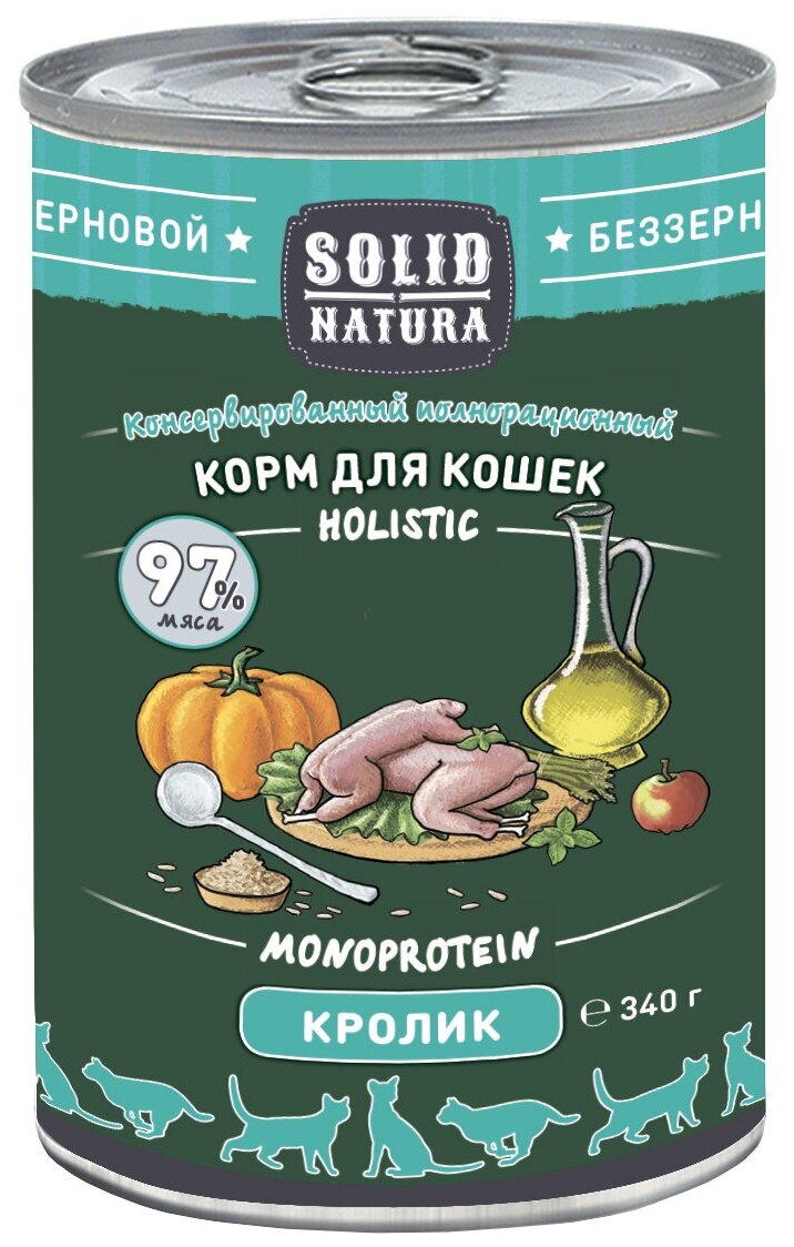 Лучшие цены. Отечественный бренд «Solid Natura» появился благодаря стараниям компании ООО «Солиднатура» и Елецкого мясокомбината. Он объединяет ряд полнорационных консервированных кормов для кошек и собак, котят и щенков. Solid Natura с кроликом - консервированное влажное питание для кошек. Беззерновое. Холистическое. Монопротеиновое. Одновременное применение данных качеств создаёт синергетический эффект. Изготовлено в России из лучших сортов отечественного мяса и птицы. Магазины в вашем городе.