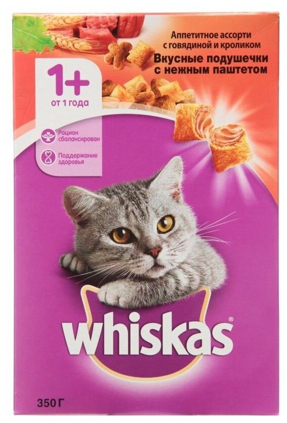 Корм сухой для кошек Whiskas, говядина, подушечки с паштетом, 350 г