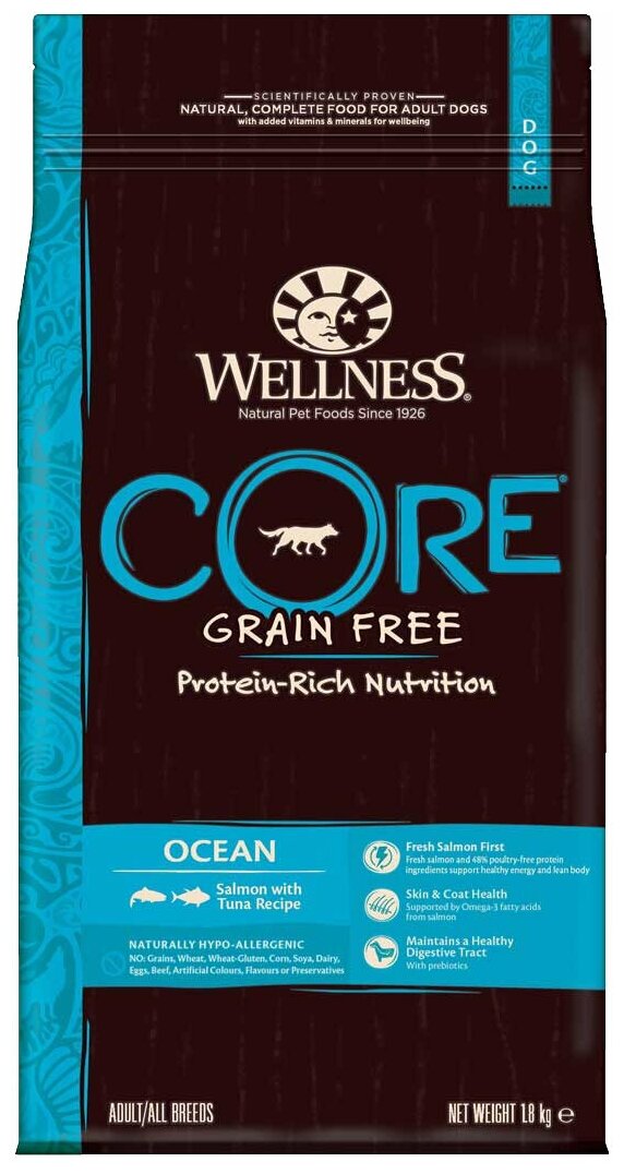 Сухой корм для собак Wellness CORE Ocean, беззерновой, лосось, тунец 1 уп. х 1 шт. х 1.8 кг (для средних и крупных пород)