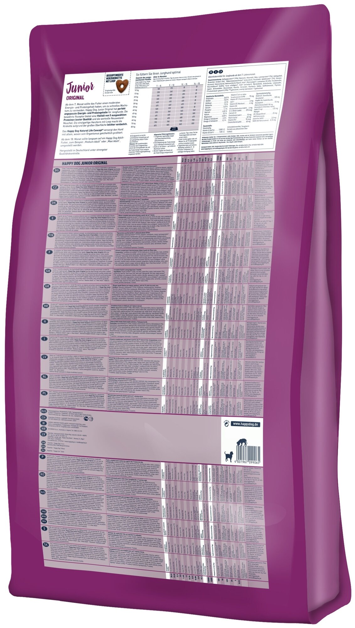 Лучшие цены. Начиная с 7-го месяца жизни необходим корм умеренной калорийности с небольшим количеством белка — это позволит избежать слишком быстрого роста. Корм Happy Dog Junior Original отличается идеальной калорийностью и оптимальным содержанием белков и подходит для особенно чувствительных молодых собак. Этот прекрасно зарекомендовавший себя корм не содержит злаков и включает в свой состав 5 отборных белков наивысшего качества, а также ценное мясо новозеландского моллюска. Магазины в вашем городе.