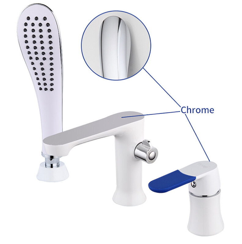 Лучшие цены. Смеситель на борт ванны Frap H34 F1134 с душевым гарнитуром. Характеристики: - Цвет: белый, хром. - Материал: латунь. - Управление: однорычажное. - Механизм: керамический картридж. - Излив: фиксированный. - Тип подводки: гибкая подводка. - Стандарт подводки: G 1/2. - Монтаж: на борт ванны. - Отверстия для монтажа: 3. - Выдвижная лейка душа. - Длина душевого шланга: 1.5 м. - Аэратор. В комплекте поставки: - Смеситель. - Душевой шланг. - Ручная лейка. - Набор накладок на ручку - 6 шт. Магазины в вашем городе.