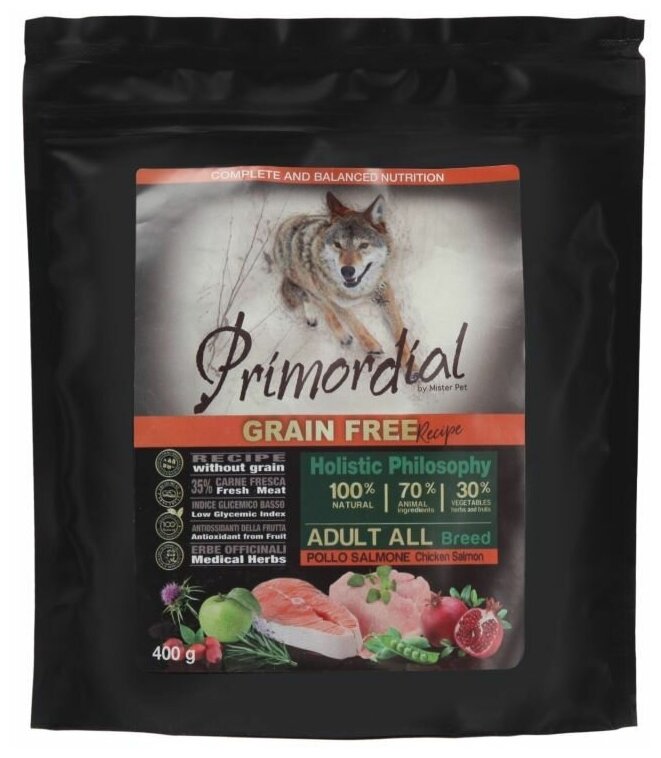 PRIMORDIAL 400г корм сухой для собак беззерновой курица лосось 1х10, шт