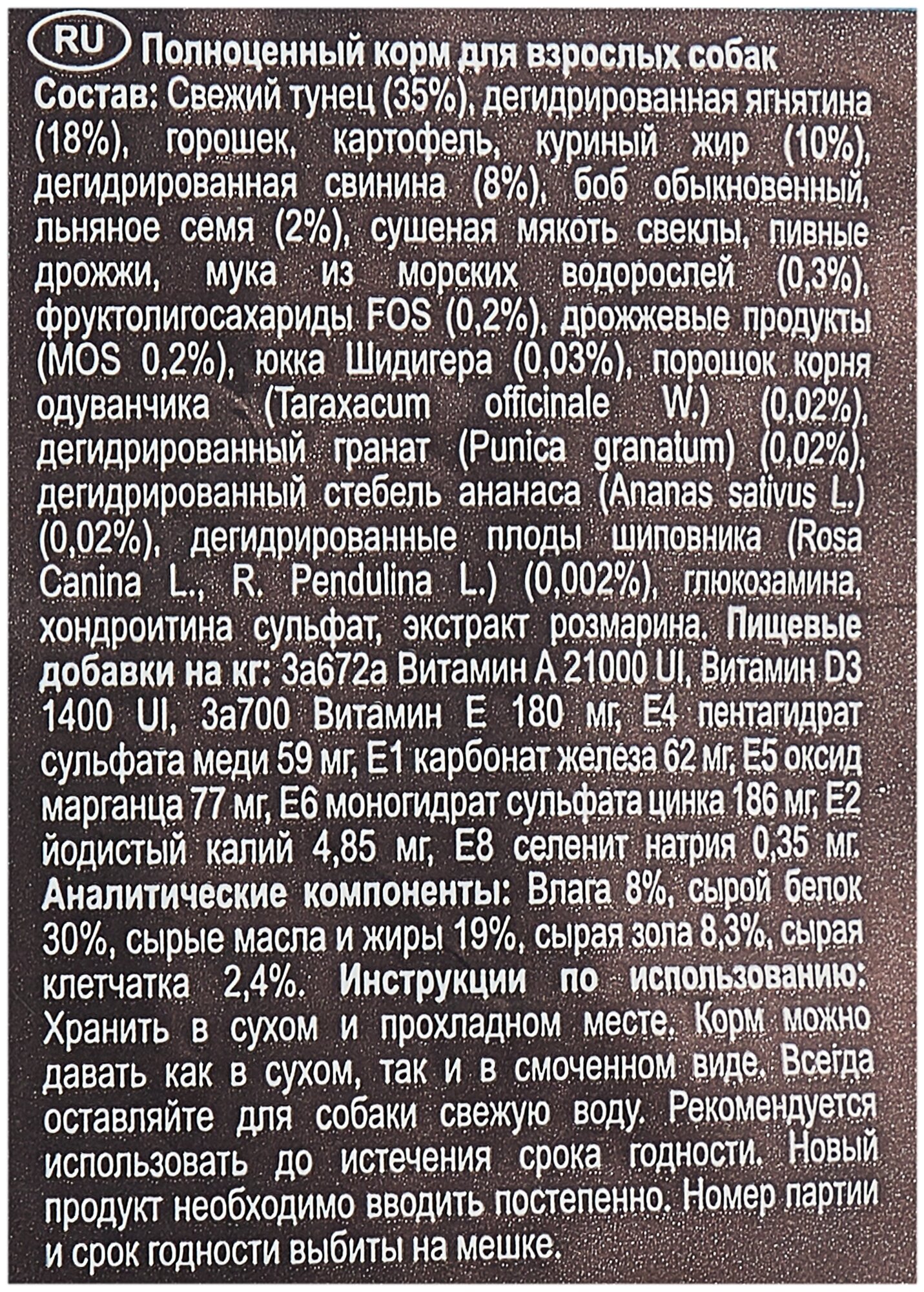 Лучшие цены. Полноценный сбалансированный беззерновой рацион с тунцом и ягненком для взрослых собак всех пород – природная энергия Вашего питомца!Специально отобранные виды мяса и рыбы поддерживают низкий гликемический индекс, гарантируют высокую аппетитность и перевариваемость корма.Ключевые особенности: Не содержит зерновых культур. 35 % свежего мяса в составе обеспечивает высокую усвояемость корма. Низкий гликемический индекс. Овощи и фрукты – источники витаминов и антиоксидантов. Магазины в вашем городе.