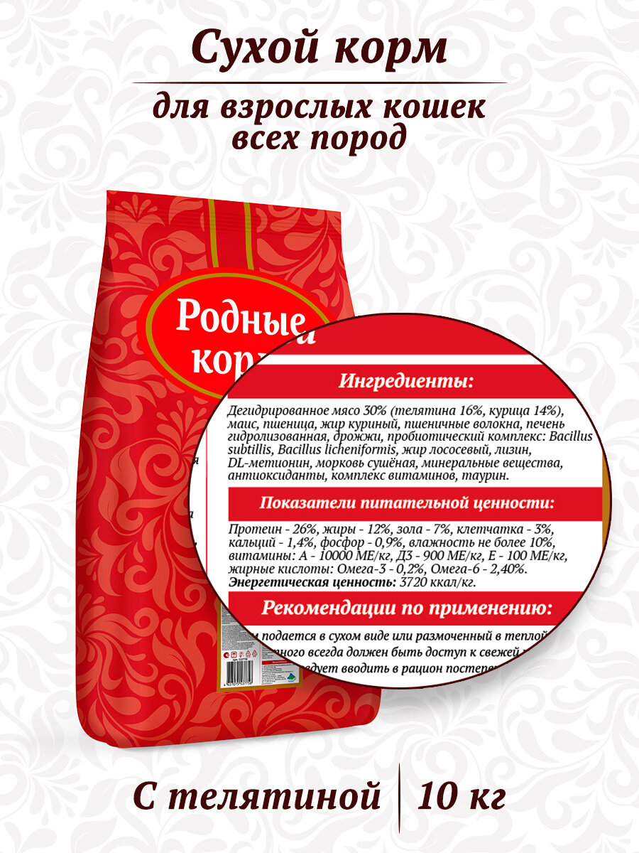 Родные Корма - Сухой корм для взрослых кошек с телятиной (10 кг)