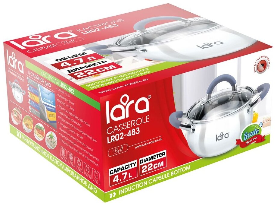 LR02-483 Кастрюля LARA (нерж) серия BELL 22x12,5см, 4,7л, капс. инд дно, силик. ручка, стекл. крышка