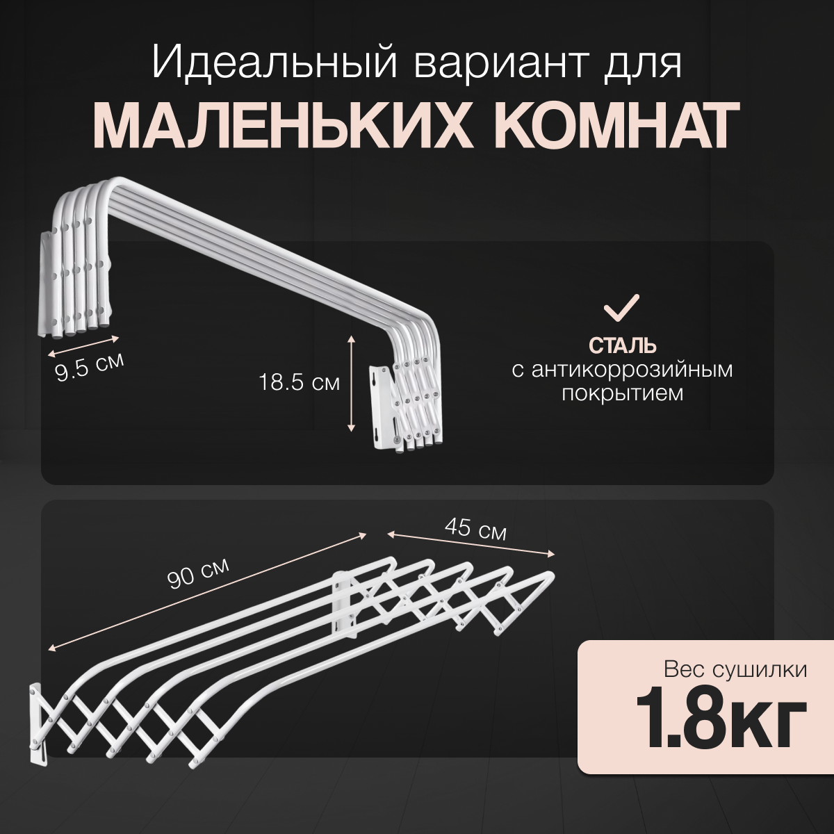Сушилка настенная д/белья (гармошка)4,5м(Д90*Ш45*В18,5см)БЕЛАЯ металл, max нагрузка=10кг,СН90/Б Nika