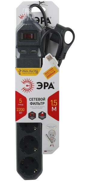 Сетевой фильтр ЭРА (черный) 5 гнезд+2USB 1,5м.