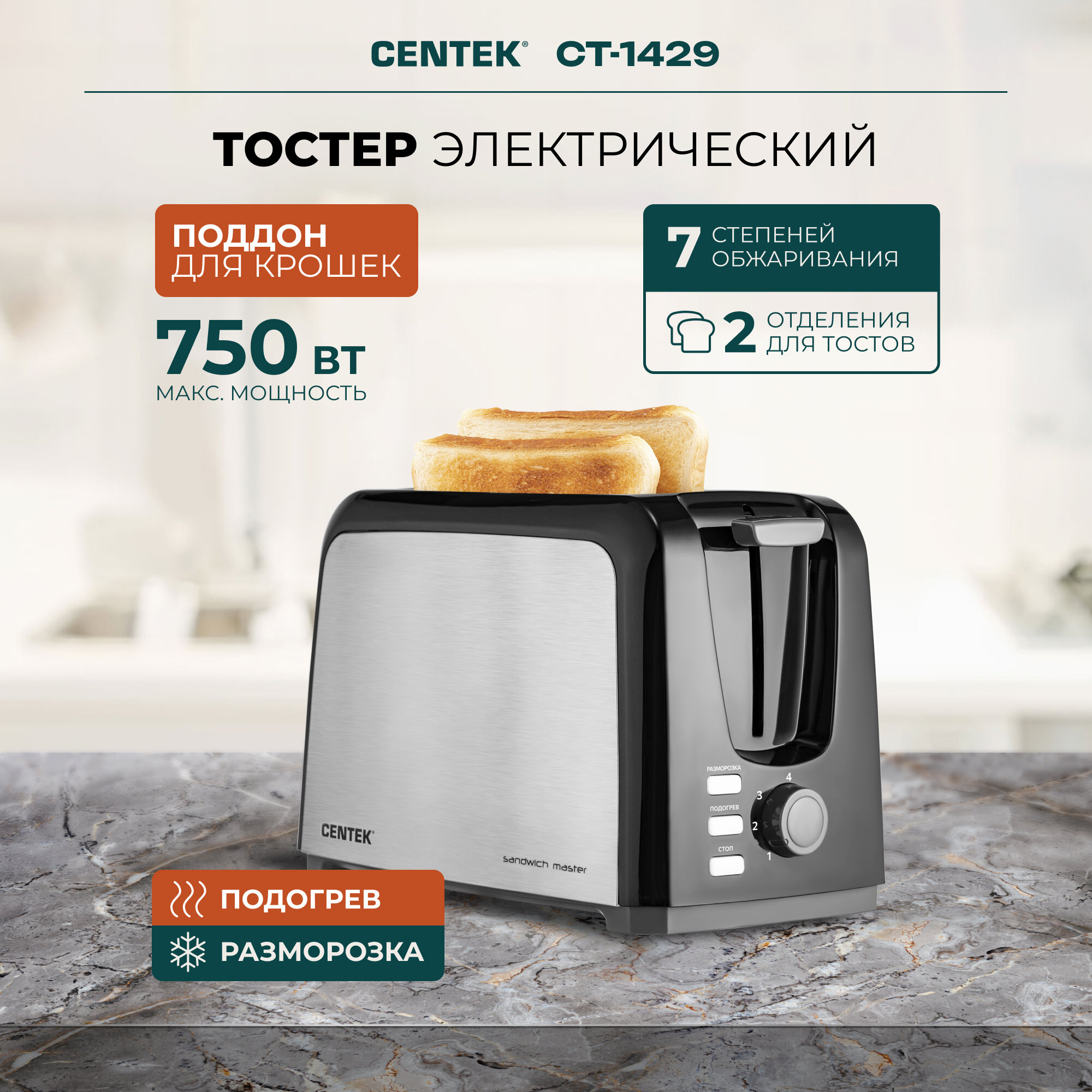 Тостер для хлеба CENTEK CT-1429: 750 Вт/ 7 уровней прожарки/ 2 тоста/ поддон/ стоп/ подогрев/ разморозка 1 733 ₽ Подробнее