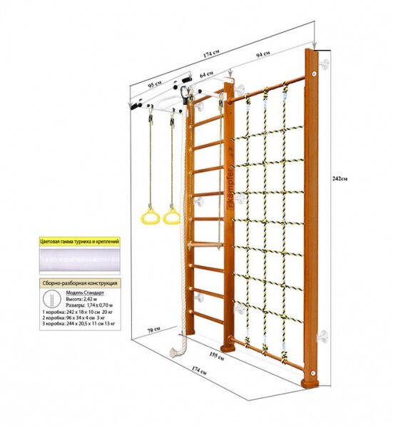 | Компоненты | лестница, турник стационарный, трапеция, канат, гимнастические кольца, гладиаторская сетка |