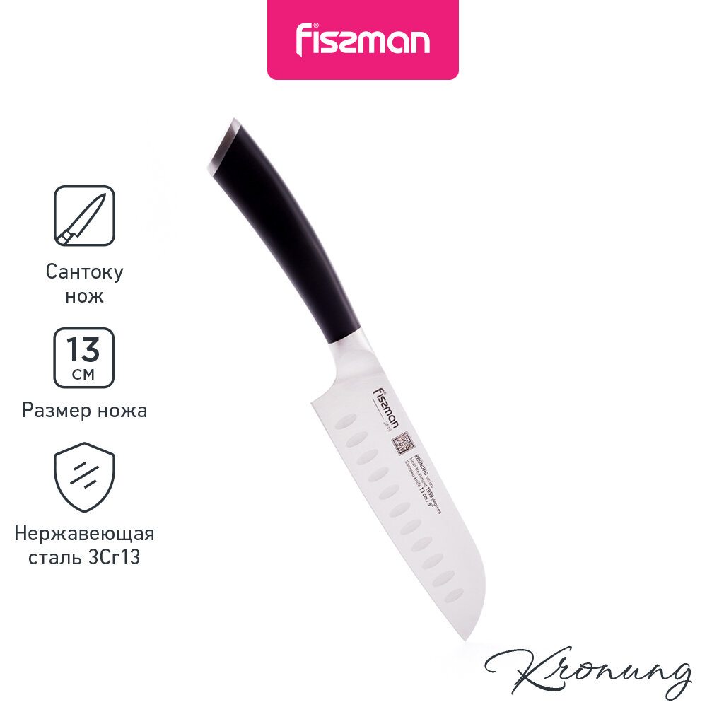 Лучшие цены. Нож Сантоку предназначен для шинковки овощей, тонкой нарезки, разделки мяса и рыбы. Углубления на поверхности облегчают использование: в них при нарезке остается воздух, поэтому продукты не налипают на лезвие. Кухонные ножи серии KRONUNG были специально разработаны дизайнерами к юбилею компании и впервые представлены на выставке в Германии. Они выполнены из высоколегированной немецкой стали X50CrMoV15, закаленной до 57 единиц по шкале Роквелла. Магазины в вашем городе.