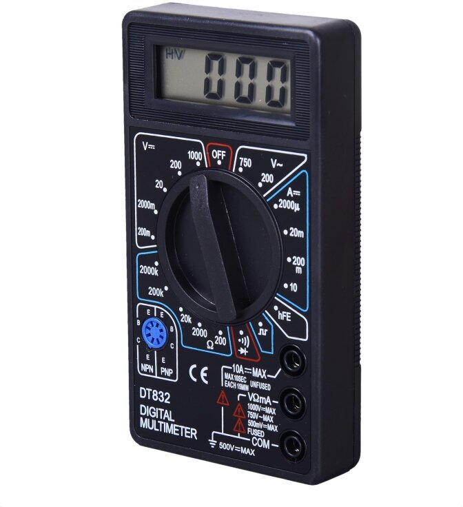 Мультиметр DT 832 широко используется как в домашнем хозяйстве и мастерских, так и в лабораториях. Он предназначен для измерений постоянного/переменного напряжения и тока, сопротивления, проверки диодов, транзисторов и звуковой прозвонки.