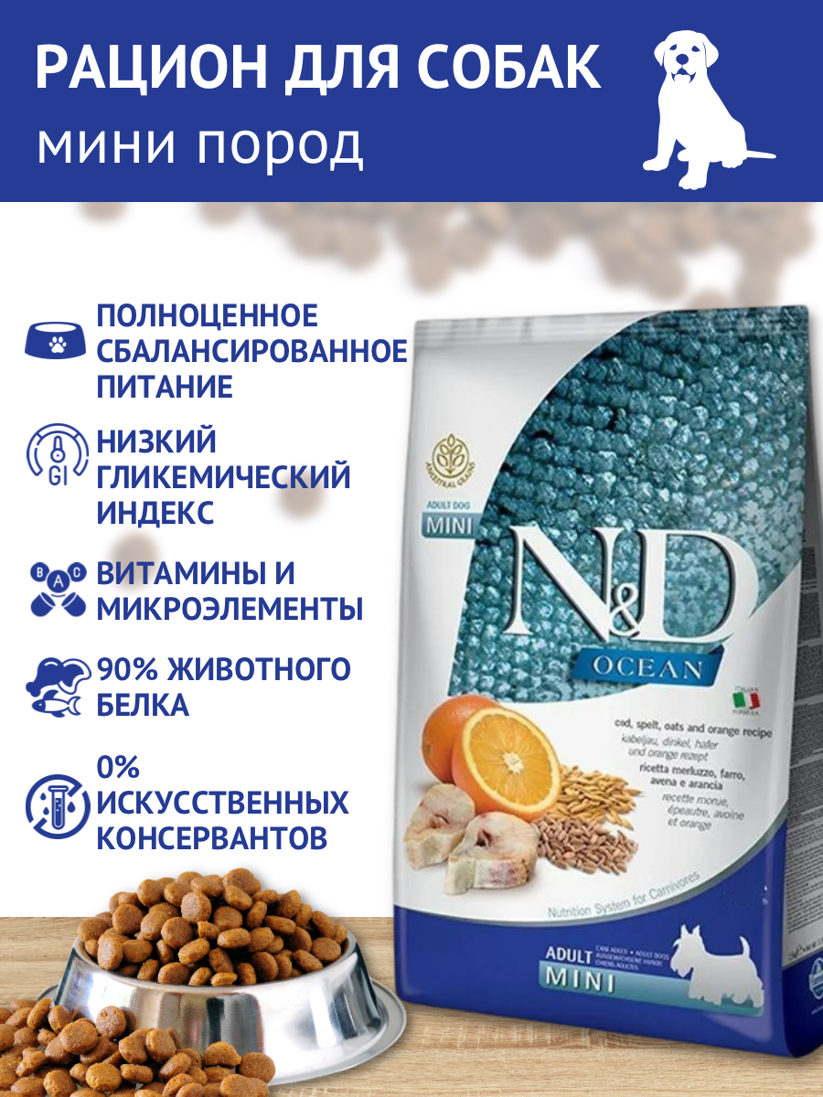 N&D ocean dog треска, спельта, овес и апельсин для взрослых собак mini 800 гр