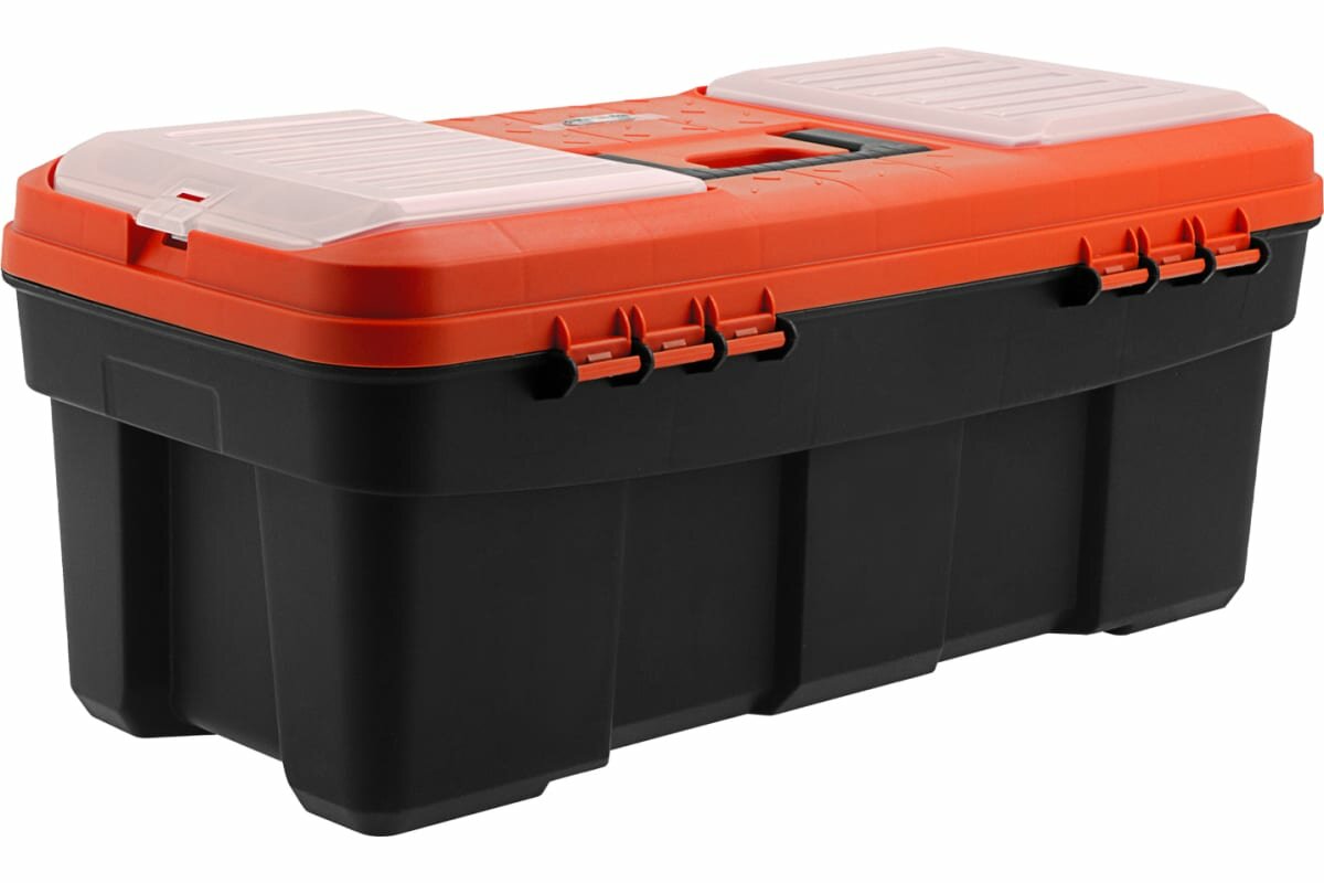 Лучшие цены. Ящик для инструмента с металлическими замками STELS 22", 560x285x235 мм 90748 — альтернатива коробке для инструментов. В нем можно расположить ручной инструмент, крепежи, хозяйственные мелочи, а также рыболовные снасти. В крышке имеются встроенные органайзеры, на дне - выкидной лоток с отсеками для мелких деталей, что увеличивает функциональность ящика. Его удобно брать в поездки, также ящик пригодится дома, на даче или в гараже. Магазины в вашем городе.