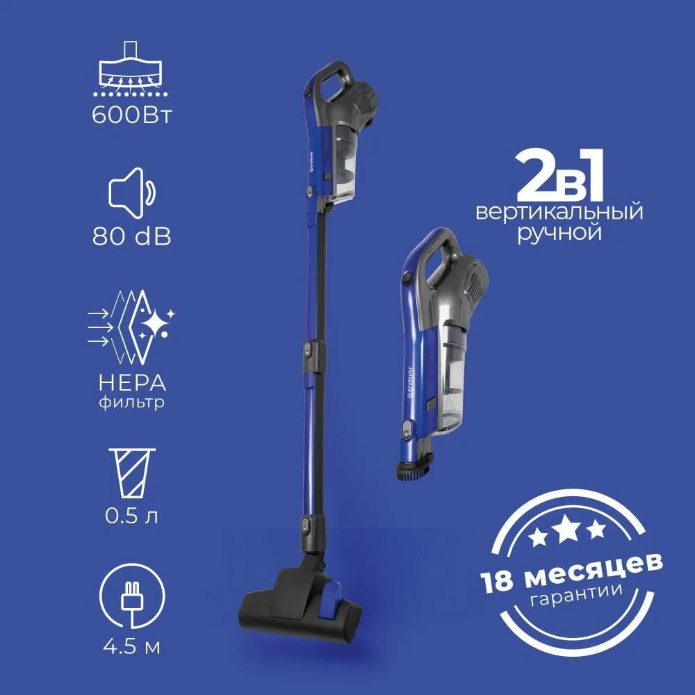 Пылесос SkyClean VC-287, вертикальный, 600 Вт, 0.5 л, синий 6 593 ₽ Подробнее