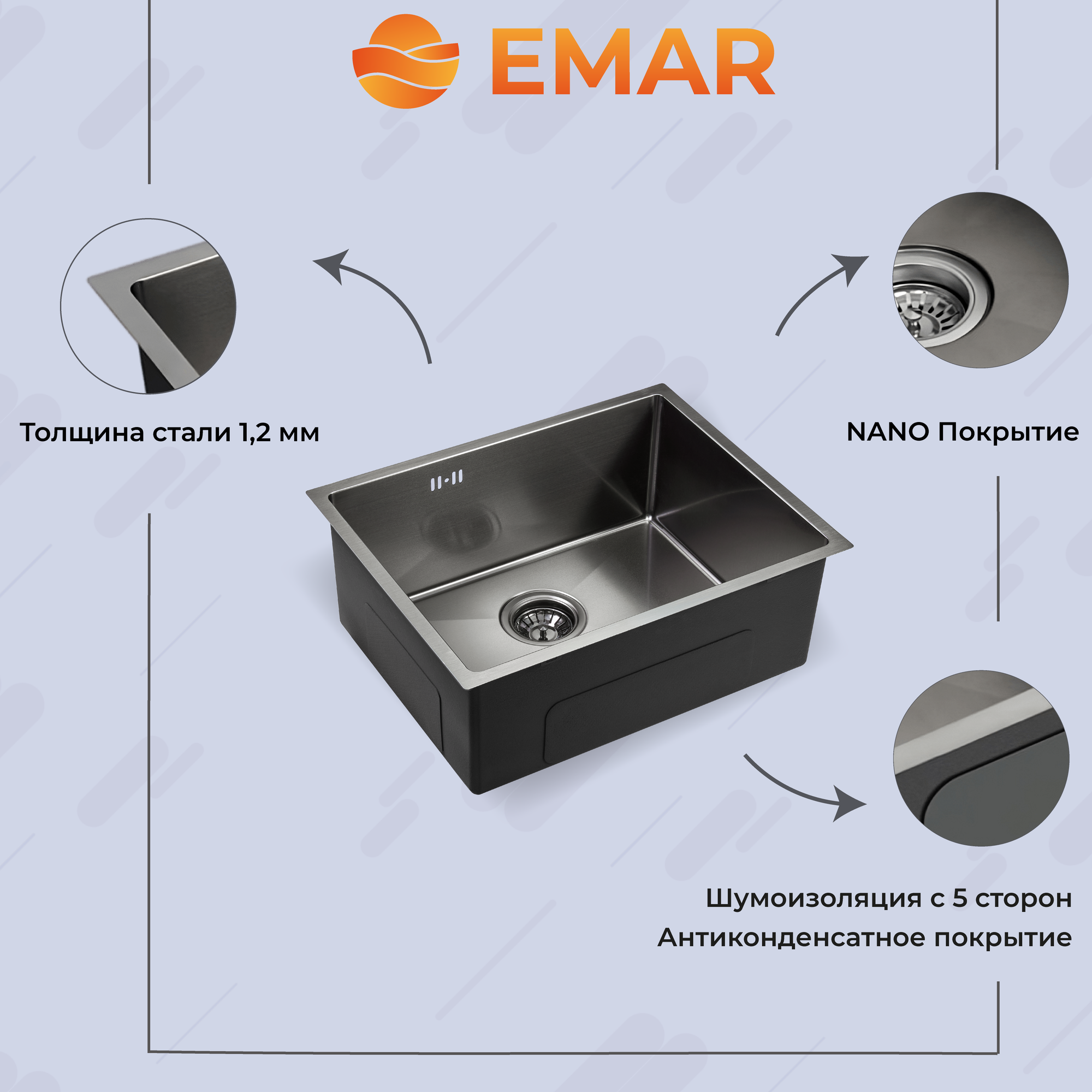 Emar Мойка из нержавеющей стали Emar EMB-123 PVD Nano Dark, мойка, нержавеющая сталь, вороненая сталь