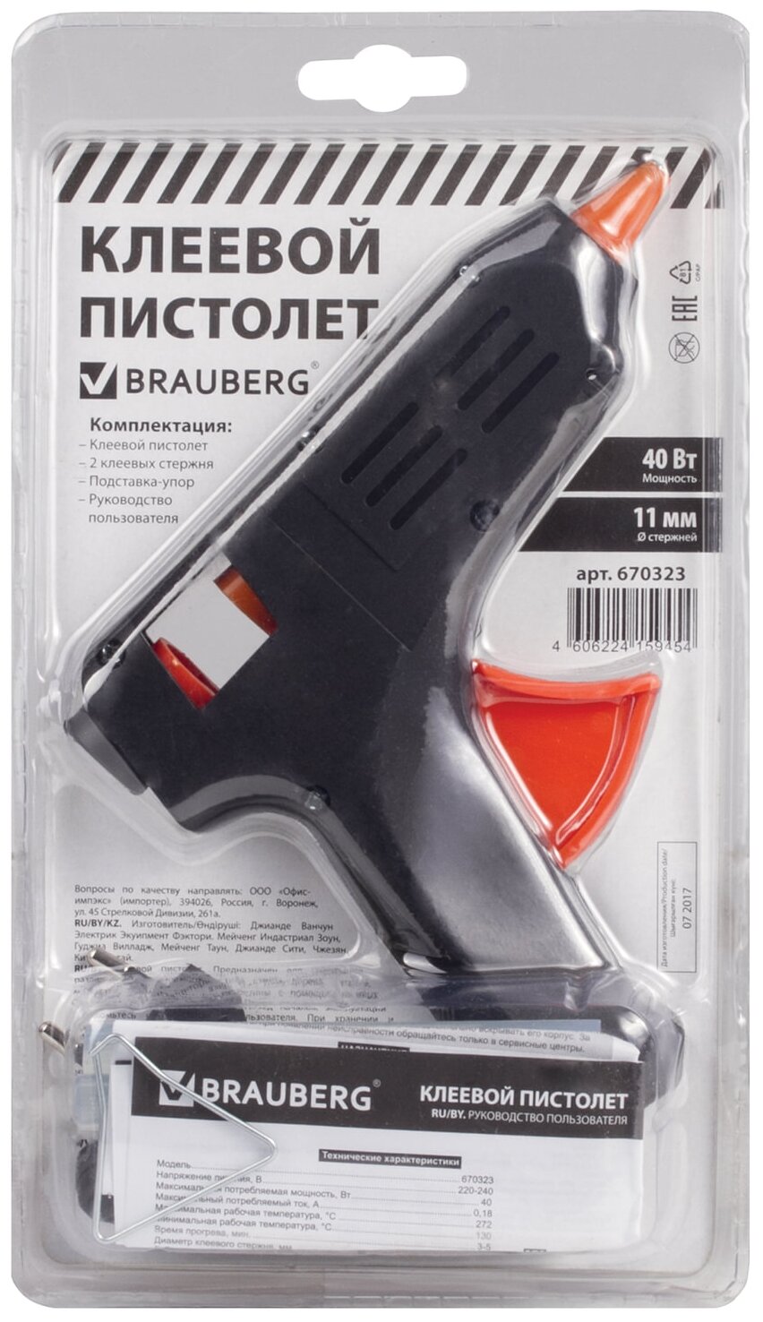 Клеевой пистолет, 40 Вт, для стержня 11 мм, BRAUBERG, в блистере, 670323 В комплекте: 1шт.