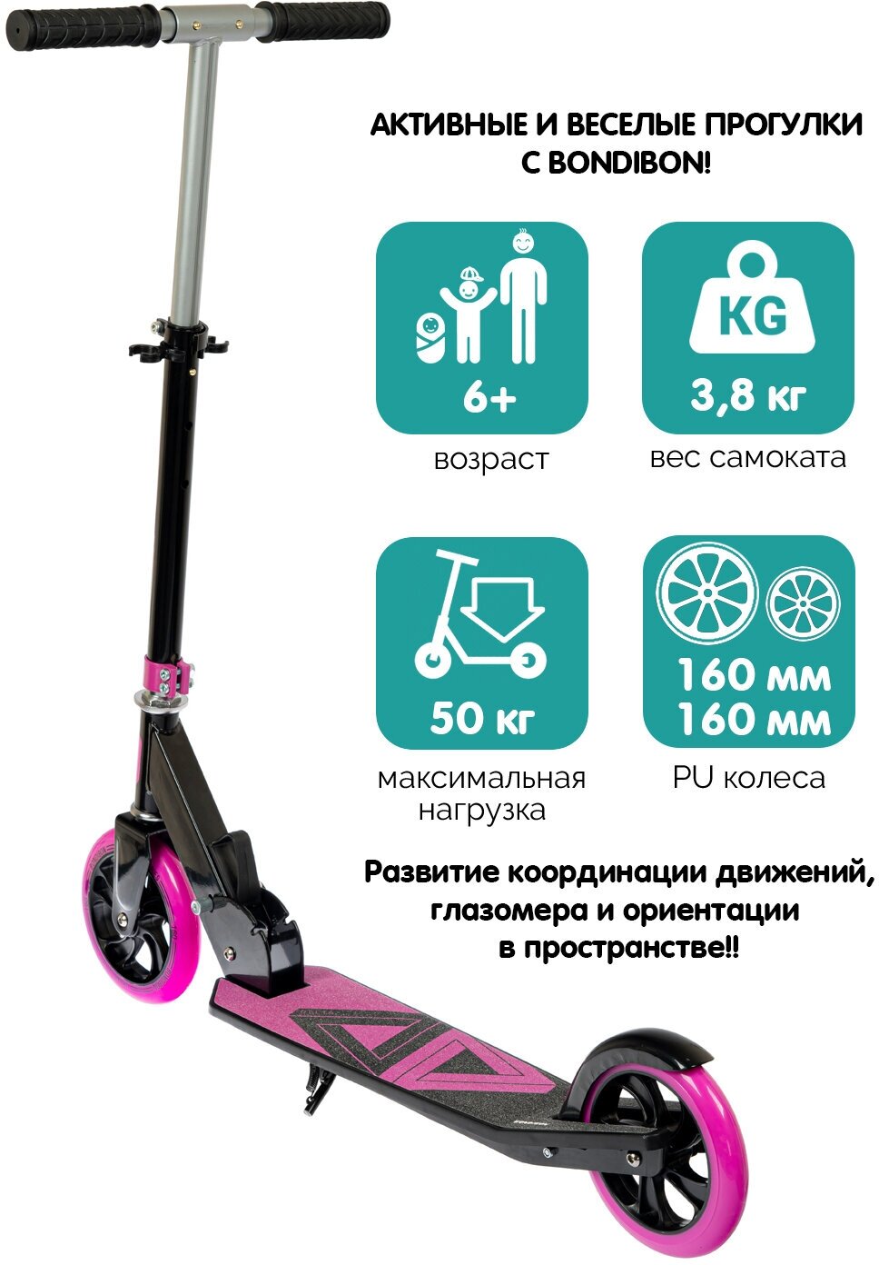 Самокат детский BONDIBON DELTA сталь+пластик, складной, колеса PU 160160мм, розовый
