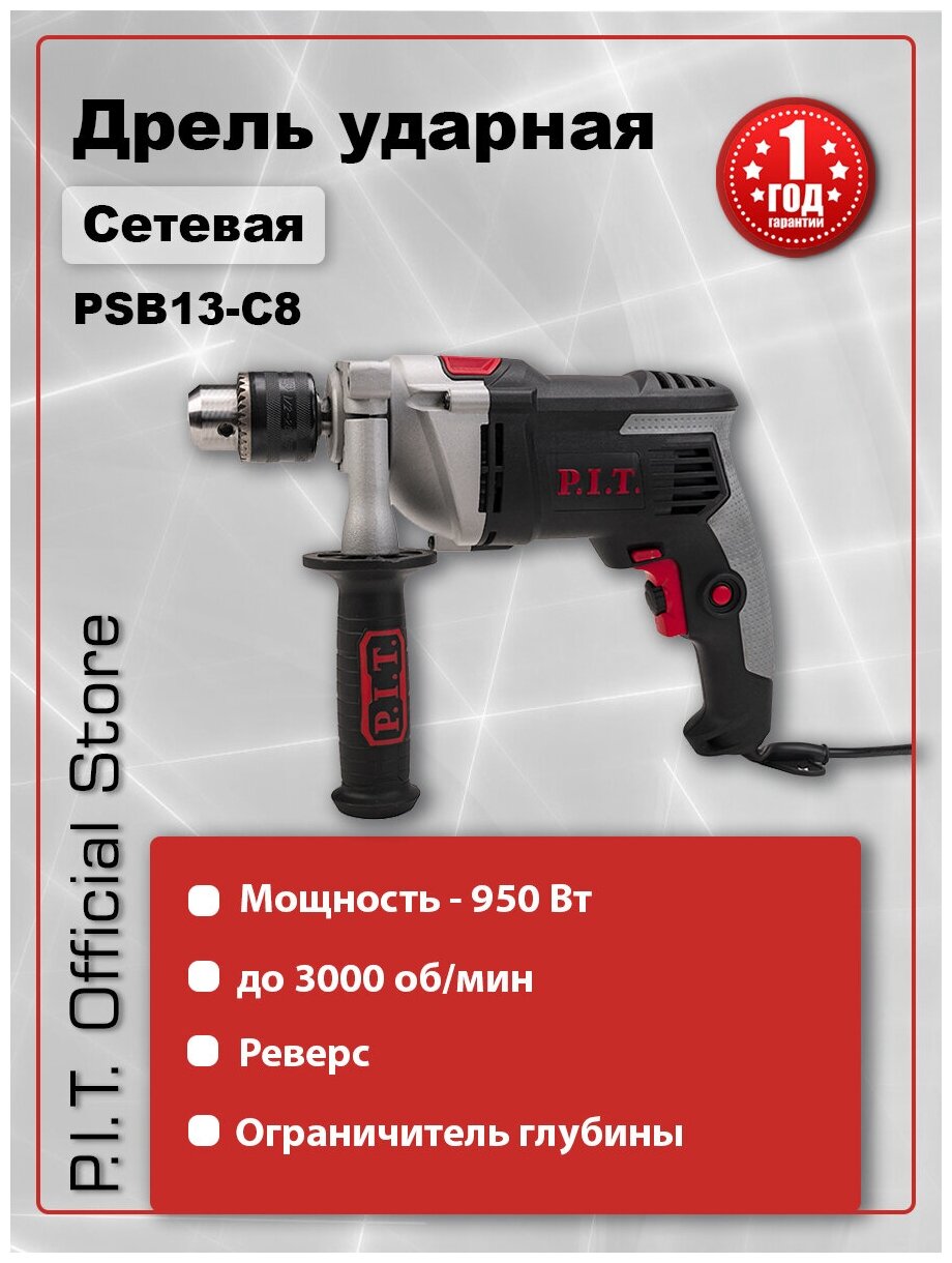 Дрель ударная PSB13-C8 (950Вт, мет. корпус редуктора,ключевой патрон 13мм, 0-3000 об/мин) P.I.T.