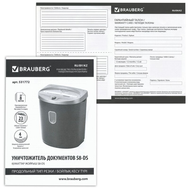 Уничтожитель (шредер) BRAUBERG S22-S, до 10 чел, 2 уров. секретности, 4 мм, 22 листа,, 531773