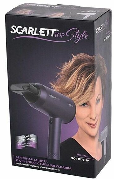 Лучшие цены. Фен Scarlett sc-hd70i39 – это компактный прибор с производительным, но тихим мотором мощностью 1600 Вт. Благодаря технологии Advenced Tourmaline (ионизация) он бережно сушит волосы, не обезвоживая их. С помощью насадки-концентратора вы сможете направить воздушный поток на отдельные пряди. Удобный И практичный Длины шнура 1,8 метра достаточно, чтобы не стеснять ваших движений перед зеркалом во время создания причёски. Режим холодного воздуха поможет вам закрепить укладку. Магазины в вашем городе.