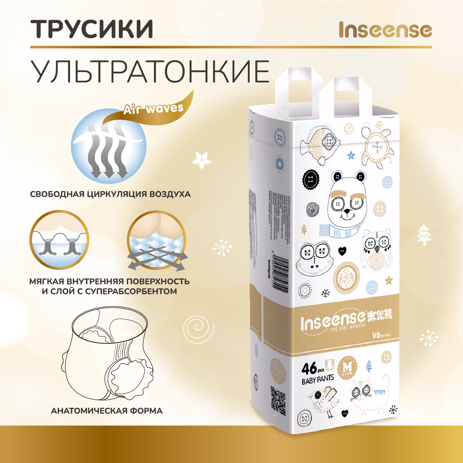 Подгузники-трусики супертонкие Inseense V6 M (6-11 кг.), 46 шт. (золотая упаковка)