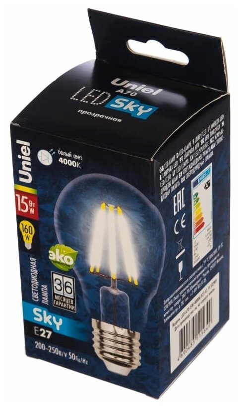 Лампочка Светодиодная лампа LED-A70-15W/4000K/E27/CL PLS02WH Форма "A", прозрачная. Серия Sky. Белый свет (4000K). Картон. ТМ Uniel.