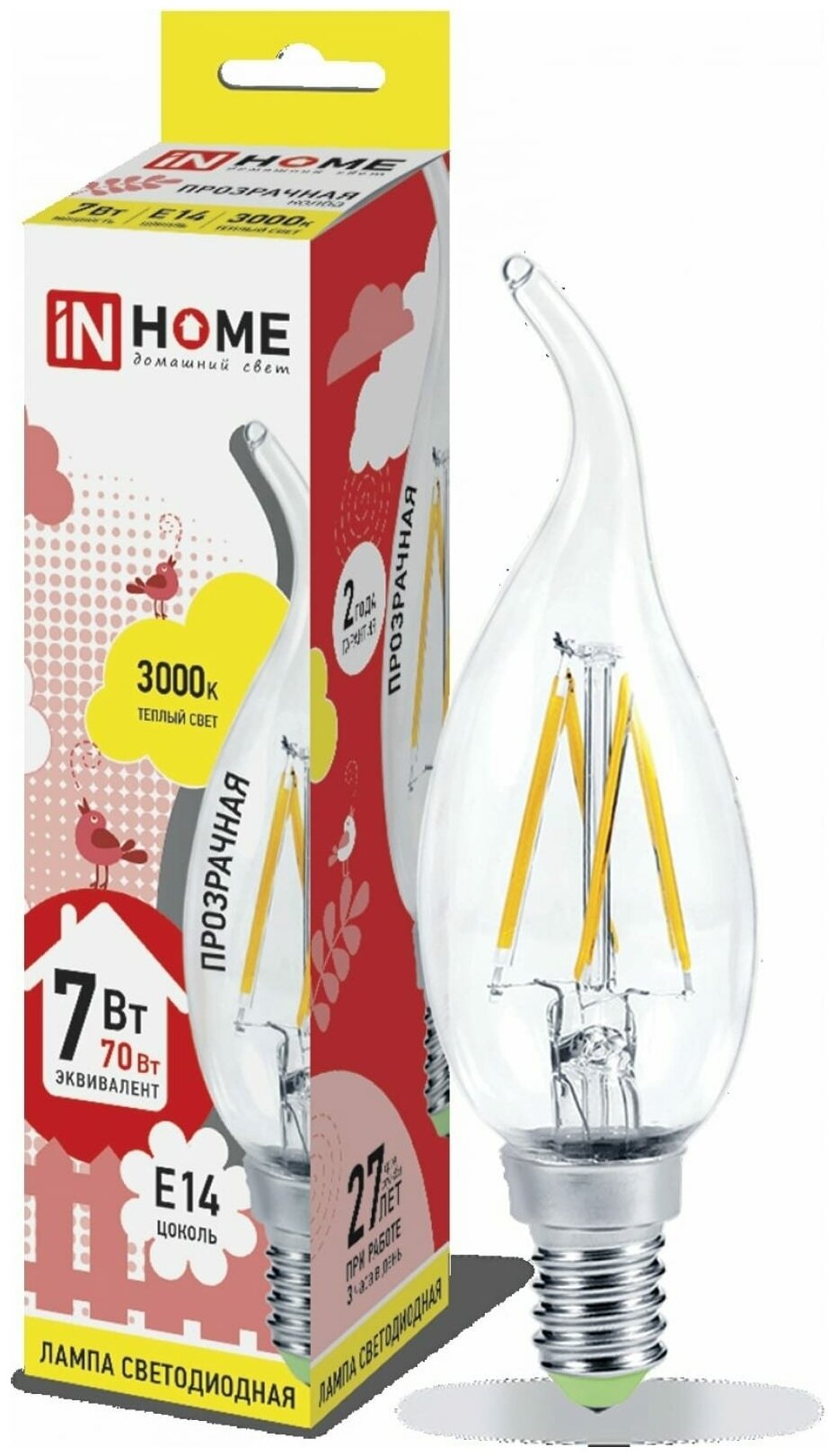 Лучшие цены. Светодиодная лампа IN HOME led-свеча на ветру-deco 7Вт 230В Е14 3000К 630Лм прозрачная 4690612007663 с инновационной филаментной нитью в качестве источника света применяется для основного и декоративного освещения в жилых и общественных помещениях. Высокая экономичность светодиодной лампы позволяет сокращать энергопотребление до 90% (по сравнению с лампами накаливания). Магазины в вашем городе.