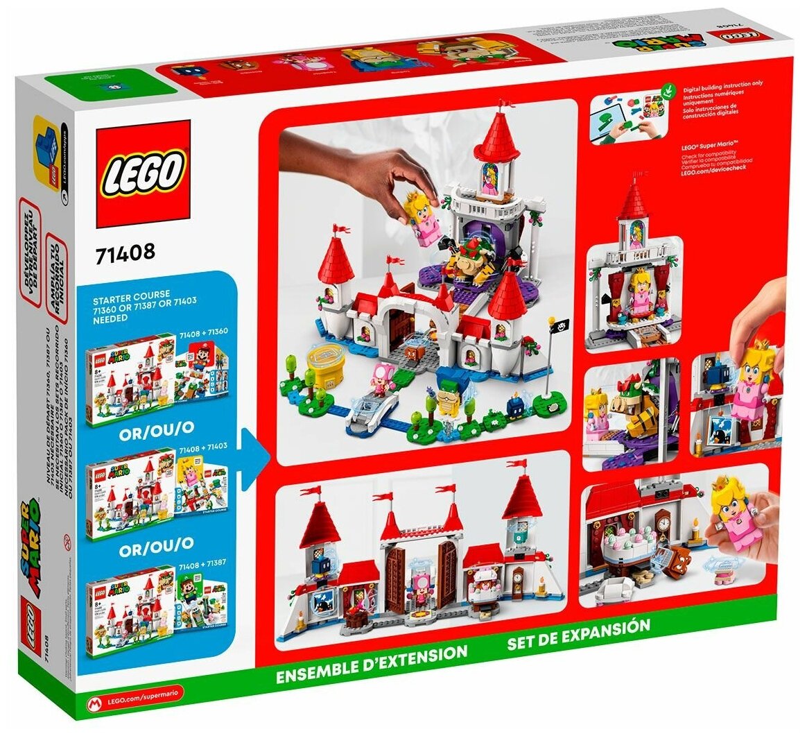 Лучшие цены. Дополнительный набор «Персиковый замок» (71408) позволяет детям перенести свой мир LEGO Super Mario на привычный уровень. Вместе с интерактивными фигурками LEGO Mario, LEGO Luigi или LEGO Peach (фигурки не входят в комплект) игроки могут исследовать новое место и собирать цифровые монеты разными способами. Включает в себя тронный зал с вращающейся стеной, за которой прячется Боузер, витраж Персика, рисунок маркера действия Боба-омбы, торт с Гумбой внутри, особую замковую трубку Персика, блок времени. Магазины в вашем городе.
