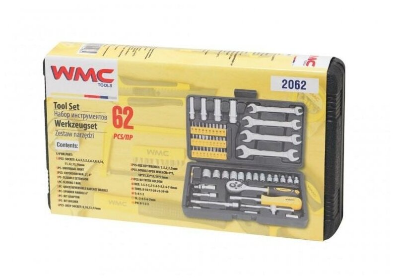 Лучшие цены. Универсальный набор инструмента WMC TOOLS WMC-2062 используется для работ с различными видами крепежа. Посадочный квадрат ¼: Головки торцевые 6-гр: 4, 4.5, 5, 5.5, 6, 7, 8, 9, 10, 11, 12, 13, 14мм Головки торцевые 6-гр. Глубокие: 8, 10, 12, 13мм Кардан шарнирный Удлинители: 50, 100мм Гибкий удлинитель Вороток Т-образный Трещотка Отвертка-вороток Битодержатель ¼”х1/4” Адаптер переходник под шуруповерт ¼ Набор ключей шестигранных: 1.5, 2, 2.5ии Ключи рожковые: 8х9, 10х11, 12х13, 14х15 Биты: HEX: 1.5, 2, 2.5. Магазины в вашем городе.