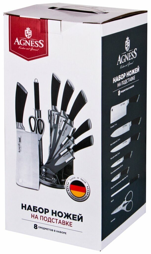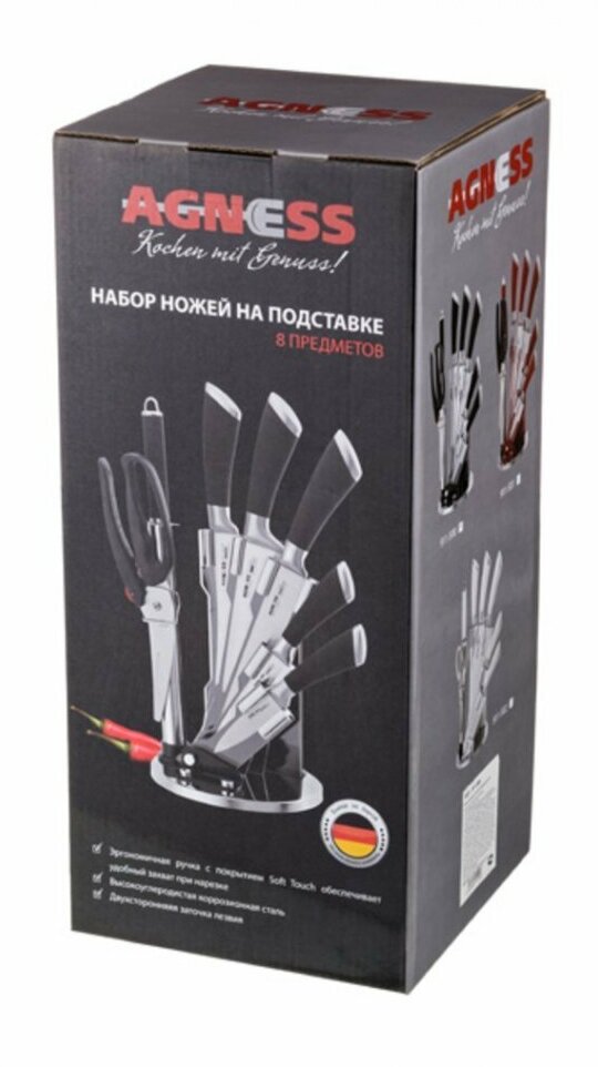 Лучшие цены. Набор ножей нжс с силиконовыми ручками на пластик. подставке 8 пр. Agness (911-501) Нож - главный инструмент на кухне, а вернее ножи, т. к. даже самый лучший нож не сможет справиться со всем многообразием задач. Выбирая набор ножей AGNESS - Вы приобретаете комплект самых необходимых и чаще всего используемых ножей. Преимущества ножей AGNESS: ● Эргономичная ручка с покрытием Soft Touch для удобной нарезки ● Лезвие из высокоуглеродистой коррозионной стали ● 2-х стороняя заточка лезвия ● Удобная вращающаяся. Магазины в вашем городе.