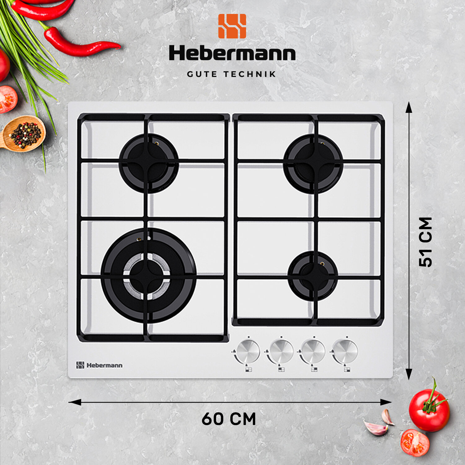 Варочные поверхности Варочная панель, газовая 4 конфорки Hebermann HBGG 604.1 W,Материал поверхности: Закалённое стекло Материал решёток: Чугун Термостойкие ручки Hitech Управление: Механическое, Электроподжиг, Газ-контроль