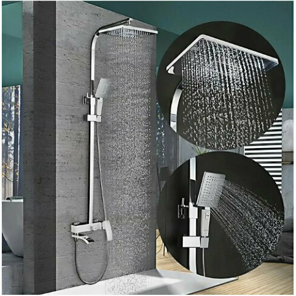 | Комплектация | ручной душ (душевая лейка) / верхний душ (тропический) / смеситель / стойка / штанга / душевой шланг / крепление ручного душа / полка (в виде верхней части смесителя) |