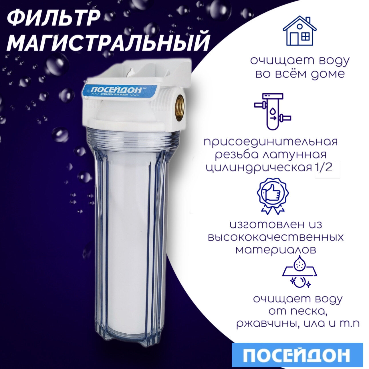 Фильтры для воды Фильтр магистральный посейдон "ПОСЕЙДОН-1Р" прозрачный 1/2" с картриджем ЭФГ 63/250 - 5 мкм. Очищает воду во всем доме.