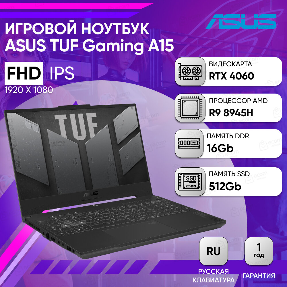 Ноутбук ASUS TUF Gaming A15 2024 FA507UV-LP027, 15.6" FullHD (1920x1080) IPS 144 Гц/AMD Ryzen 9 8945H 4.0 ГГц, 8 ядер/16 ГБ DDR5 5600 МГц/512 ГБ SSD/NVIDIA GeForce RTX 4060 8 ГБ/Без операционной системы, серый (90NR0I25-M001D0)