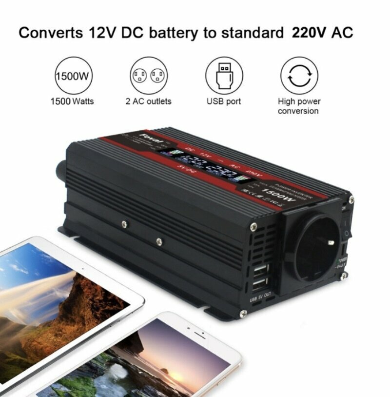 Лучшие цены. Преобразователь напряжения. Инвертор. Автомобильный преобразователь напряжения. 1500Вт 1500w Материал: алюминиевый сплав Форма сигнала выходного напряжения: Модифицированный синус Пиковая выходная мощность: 1500 Вт Непрерывная выходная мощность: 950 Вт Выходная мощность 30 минут: 750 Вт USB: Двойной USB 3.1A -Входное напряжение: DC12V -Выходное напряжение: ac220в -Вес: 900 гр -Размер: 210х110х60 мм Особенности: -Интеллектуальный двойной цифровой дисплей, поддержка батареи адаптера солнечной панели. Магазины в вашем городе.