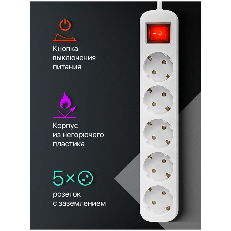 Удлинитель с выключателем Defender S 5.0 м, 5 розеток, белый
