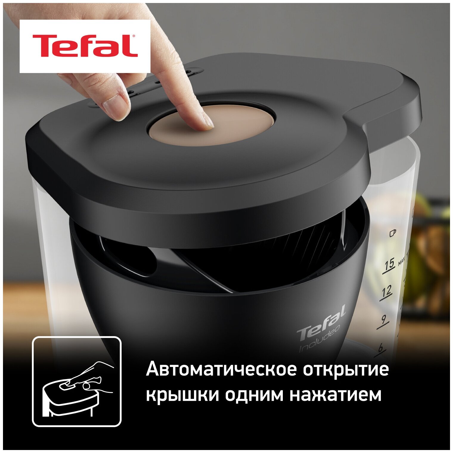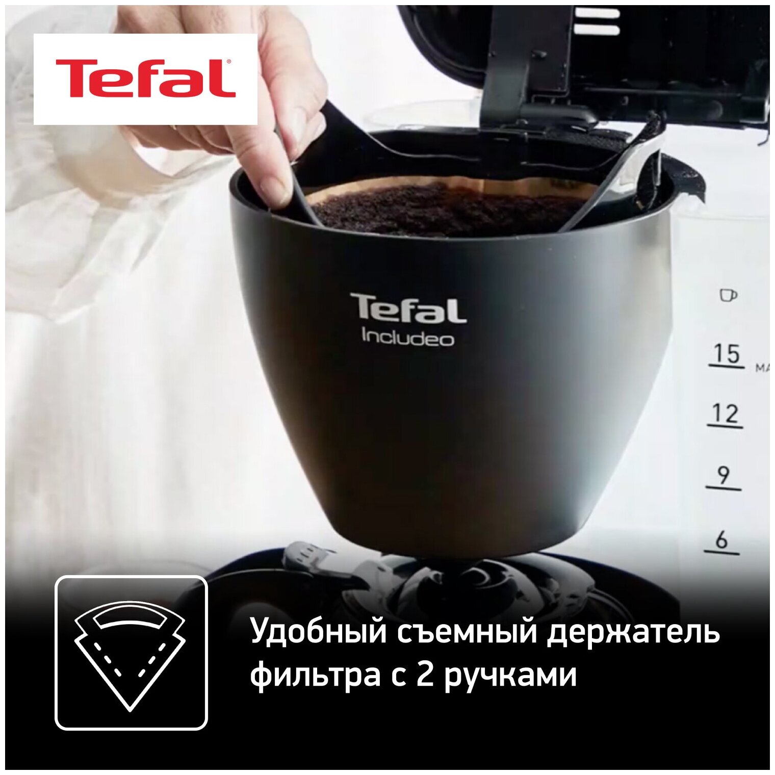 Лучшие цены. Tefal продумал все, чтобы облегчить вашу повседневную жизнь: крышка, которая автоматически открывается при нажатии большой кнопки и легко снимаемый держатель фильтра. Эта кофеварка с емкостью 1,25 л идеальна для приготовления 10-15 чашек кофе. Она оснащена большим прозрачным резервуаром для воды с четкими, легко читаемыми индикаторами уровня воды, которые облегчают заправку и обеспечивают точное дозирование, а также эргономичной ручкой. На передней панели расположена большая кнопка включения / выключения. Магазины в вашем городе.