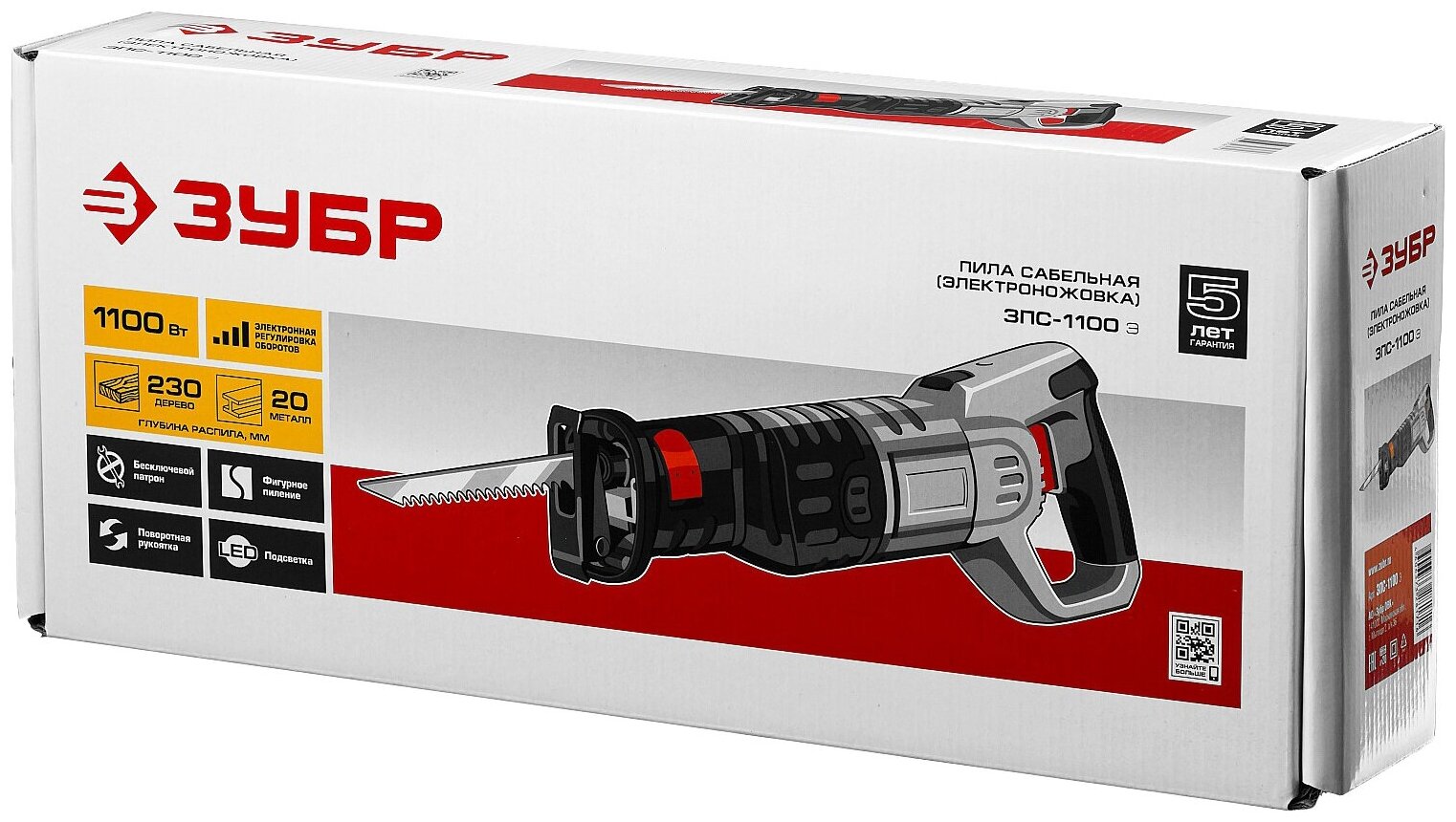 Пила сабельная (электроножовка), ЗУБР ЗПС-1100 Э, 1100 Вт, 800-2700 ход/мин, рез 230 мм (дерево), 20 мм (сталь), ход штока 29 мм(ЗПС-1100 Э)