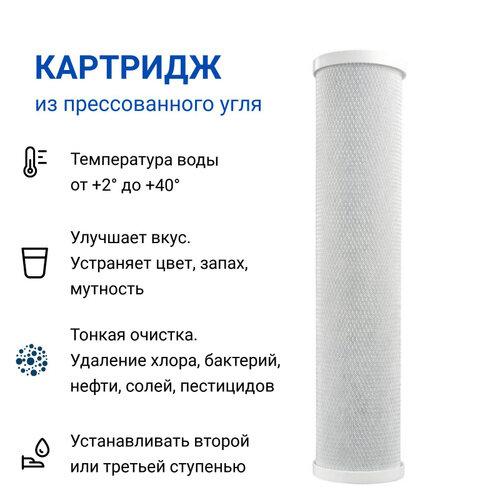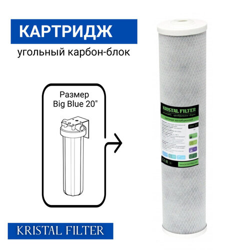 Лучшие цены. Картридж адсорбционный Kristal Filter Big Blue 20" CP Состоят из активированного угля, адсорбирующего на своей поверхности органические вещества, соединения хлора, пестициды и гербициды. Улучшает органолептические показатели воды (вкус, запах, цвет). Картриджи CP состоят из прессованного активированного угля; они применяются для финишной очистки вплоть до удаления растворенных газов. Магазины в вашем городе.