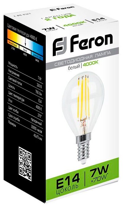 Лампа светодиодная LB-52 Шарик E14 7W 4000K, FERON 25875 (1 шт.)