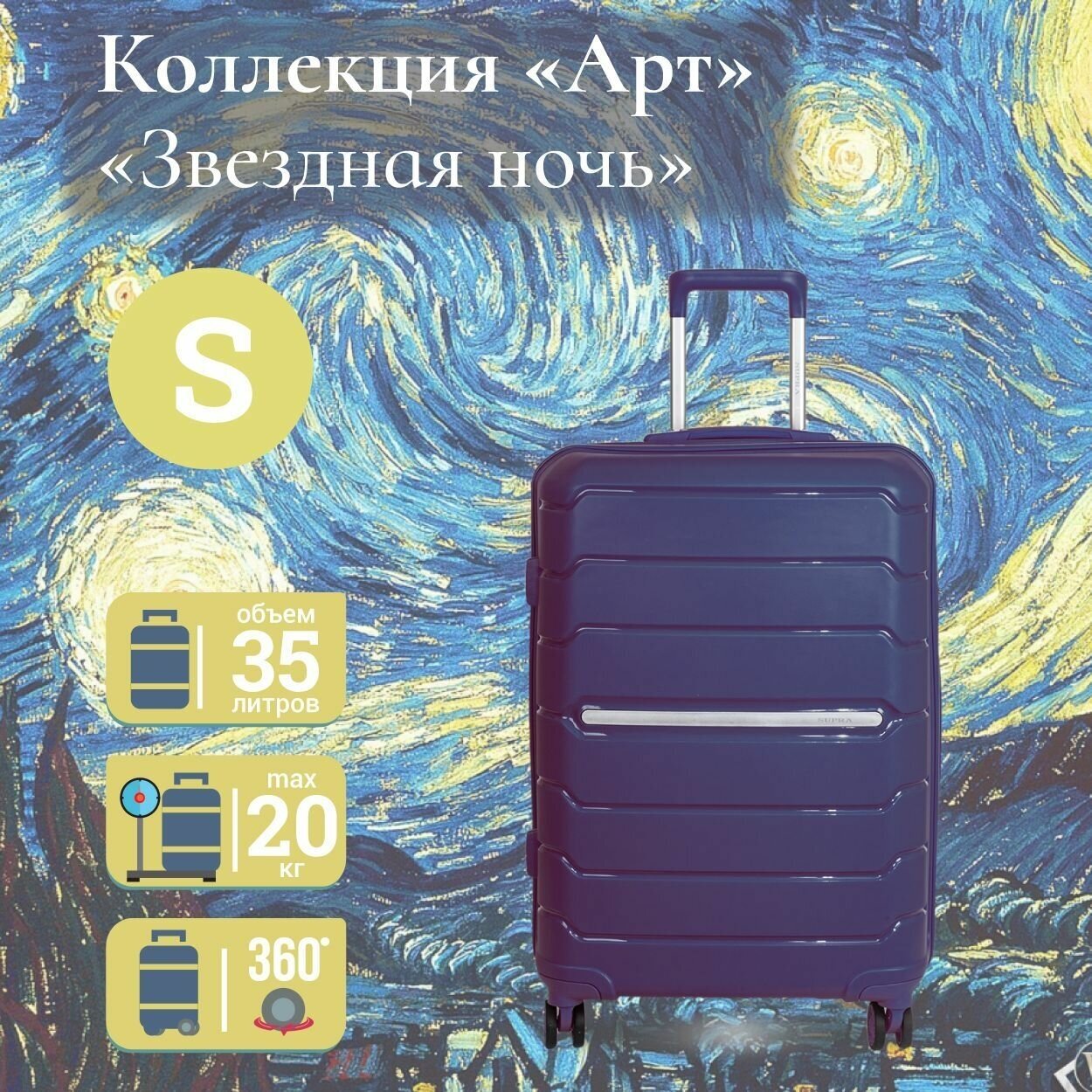 Лучшие цены. Впервые в России уникальная коллекция багажа с узнаваемыми принтами по мотивам шедевров мировой живописи. Возить с собой произведения искусства - это не только привилегия не только художников-передвижников. Приобщайтесь к искусству и наслаждайтесь великолепными полотнами каждый раз, когда вы открываете свой неповторимый и единственный в своем роде чемодан. SupraLuggage сверхлегкий чемодан STS-1004-S, Navy Blue из полипропилена объемом 35 л, с антивандальным кодовым замком TSA, 4 двойными колесами с. Магазины в вашем городе.