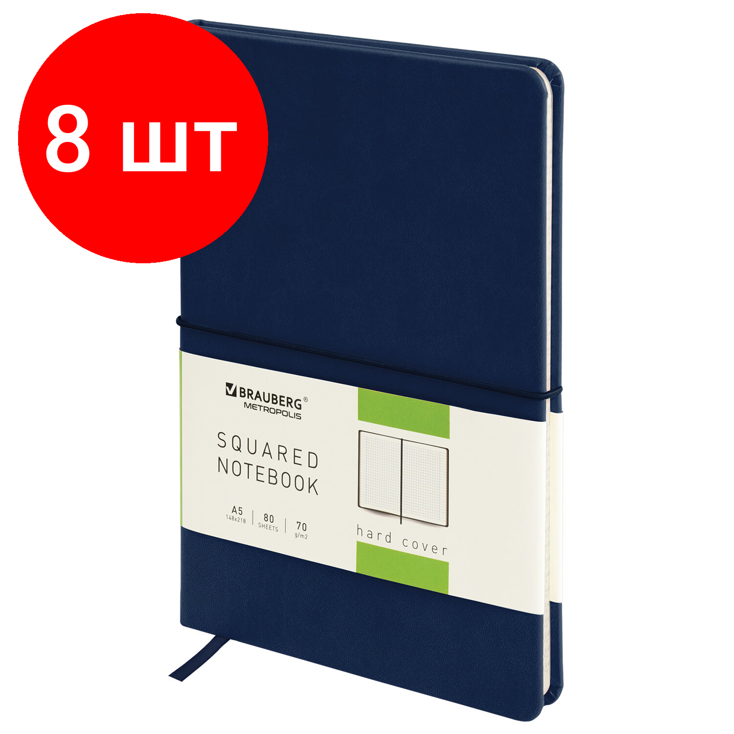 Блокноты Комплект 8 шт, Блокнот в клетку с резинкой А5 (148x218 мм), 80 л., под кожу темно-синий BRAUBERG "Metropolis X", 111031