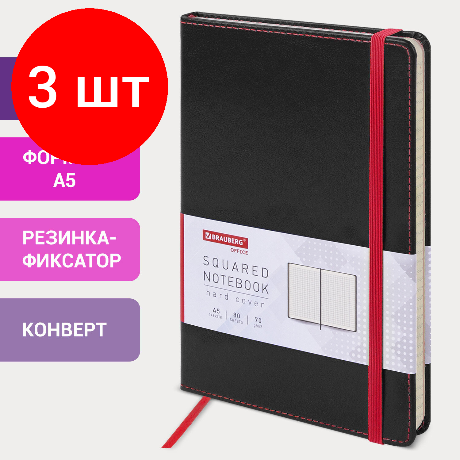Блокноты Комплект 3 шт, Блокнот в клетку с резинкой А5 (148x218 мм), 80 л., под кожу черный BRAUBERG "Office", 111027