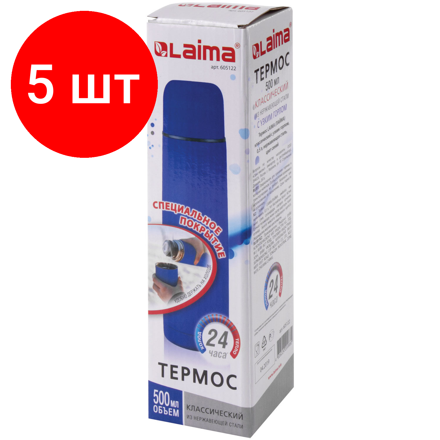 Термосы Комплект 5 шт, Термос LAIMA классический с узким горлом, 0.5 л, нержавеющая сталь, синий, 605122
